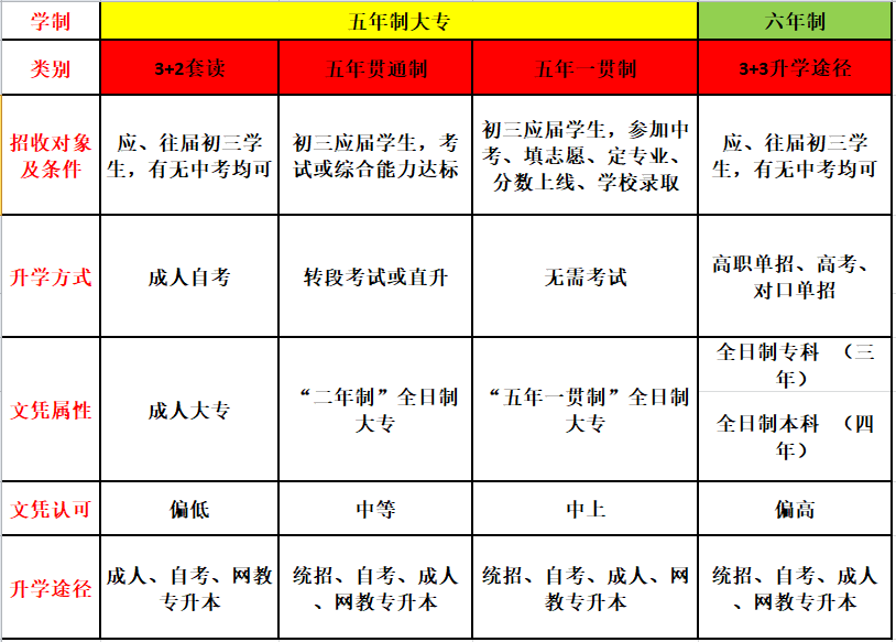 我們可以用一張圖從學制、類別、招收對象及條件、升學方式、文憑屬性、文憑認可、升學途徑,這七大方面對比各個學制之間的區別以及優劣。