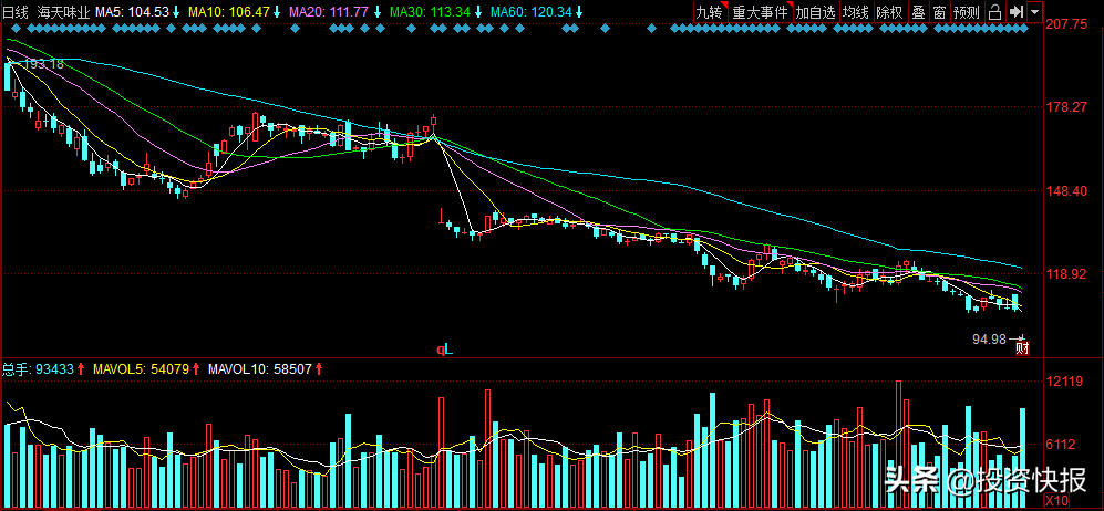 8月31日,“醬油茅”海天味業開盤一字跌停,截至午間收盤,股價報收94.98元/股,創出年內新低,總市值為4001億元。從8月25日至今,海天味業已經走出了5連陰的行情。