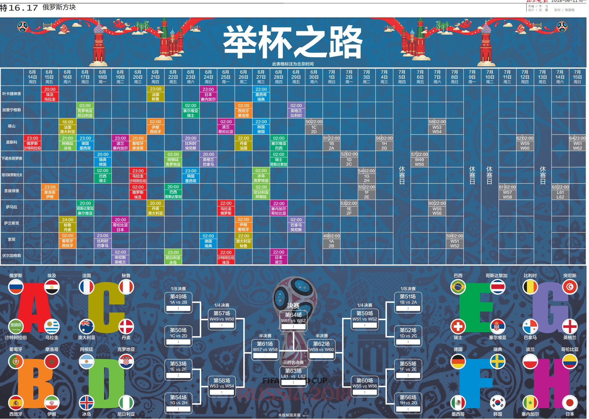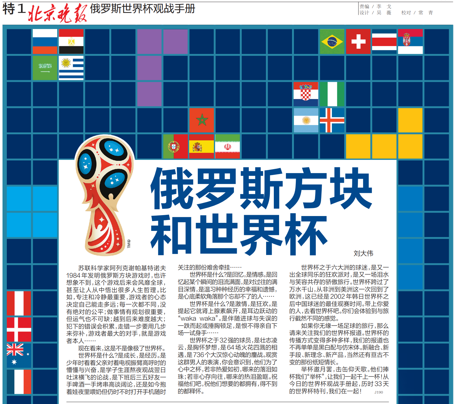 2018年俄羅斯世界杯觀戰手冊名字很有特點——《俄羅斯方塊》,將舉辦國名與日常生活元素結合在一起。手冊以介紹32支參賽球隊的當家球員過往表現及目前狀態為主,引出球隊現狀和前景。同時,手冊延續上屆設計,使用通版方式詳細展現賽程,方便球迷邊看球邊記比分,最終這本手冊實現了實用和收藏雙重價值。