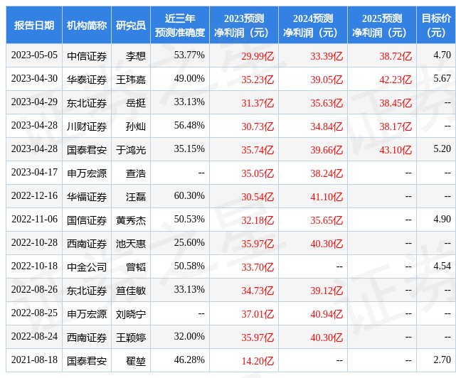 證券之星數據中心根據近三年發布的研報數據計算,華福證券汪磊研究員團隊對該股研究較為深入,近三年預測準確度均值為60.3%,其預測2023年度歸屬凈利潤為盈利30.54億,根據現價換算的預測PE為8.81。