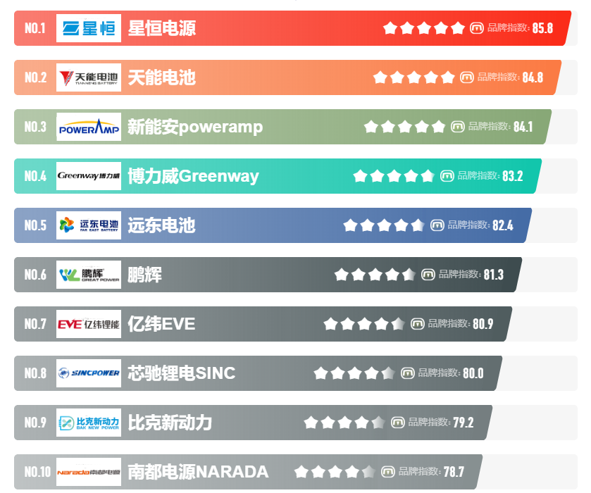 根據“2023年鋰電池十大品牌榜單”,第1名至第10名,依次為:星恒、天能、新能安、博力威、遠東、鵬輝、億緯、芯馳、比克新動力、南都電池,品牌指數最高分為85.8,分,最低為78.7分。