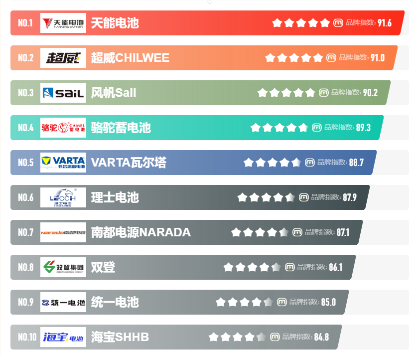 第1名至第10名,依次為:天能、超威、風帆、駱駝、瓦爾塔、理士、南都、雙登、統一電池、海寶,品牌指數最高為91.6分,最低為84.8分。