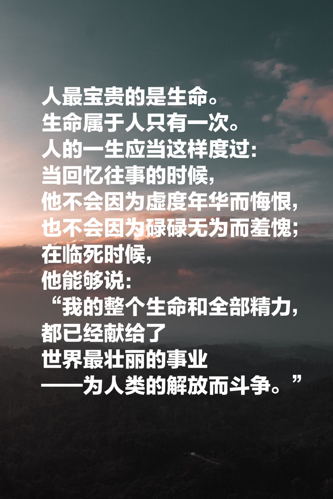 人最寶貴的是生命。生命屬于人只有一次。人的一生應當這樣度過:當回憶往事的時候,他不會因為虛度年華而悔恨,也不會因為碌碌無為而羞愧;在臨死時候,他能夠說:&34;我的整個生命和全部精力,都已經獻給了世界最壯麗的事業——為人類的解放而斗爭。&34;