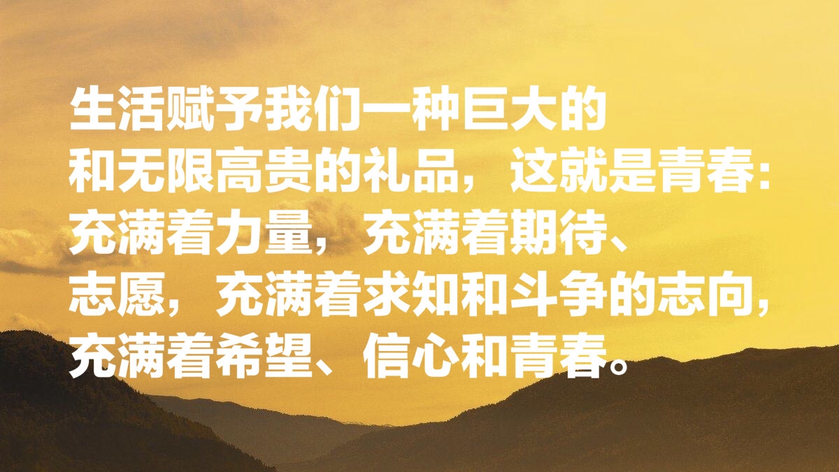 生活賦予我們一種巨大的和無限高貴的禮品,這就是青春:充滿著力量,充滿著期待、志愿,充滿著求知和斗爭的志向,充滿著希望、信心和青春。