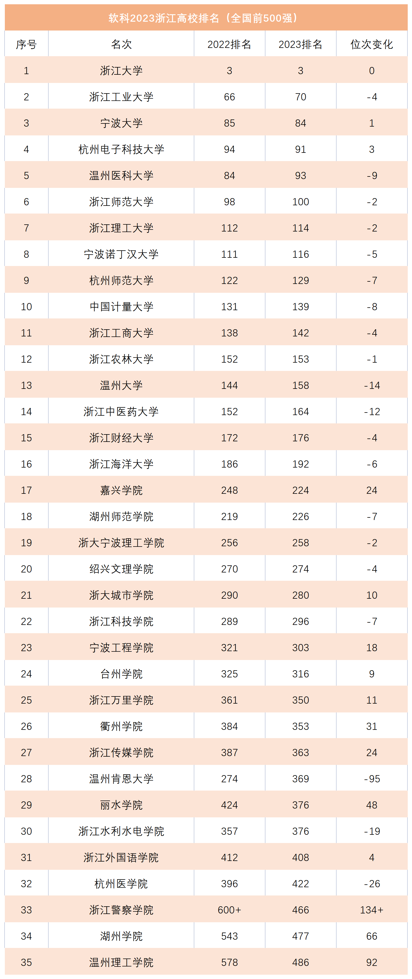 在軟科發布的2023中國大學排行榜中,浙江省共有35所高校進入全國前500強,較上年增加了3所,分別是浙江警察學院、湖州學院和溫州理工學院,這3所高校在全國的排名提升幅度都是比較大的。