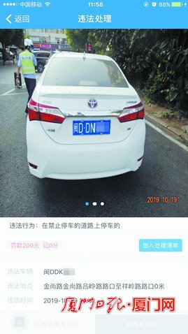 張女士打開“交管12123”App查詢,發現違法處理上的顯示時間是2019年10月19日,在金尚路呂嶺路路口至祥嶺路路口0米處,違法行為是在禁止停車的道路上停車。張女士發現,圖片顯示的是一輛白色豐田轎車,車牌號是“閩DDN***”,而下方違法車輛卻顯示的是張女士的車牌號“閩DDK***”,兩輛車的車牌號只差一個字母。張女士的車是一輛紅色大眾polo,無論車牌號、品牌、顏色,都和圖片上的車不一致。