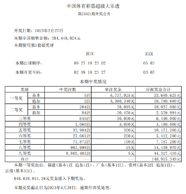 北京時間2月27日晚,體彩大樂透第23021期開獎,當期開獎號碼為前區02 09 18 23 27,后區03 05。