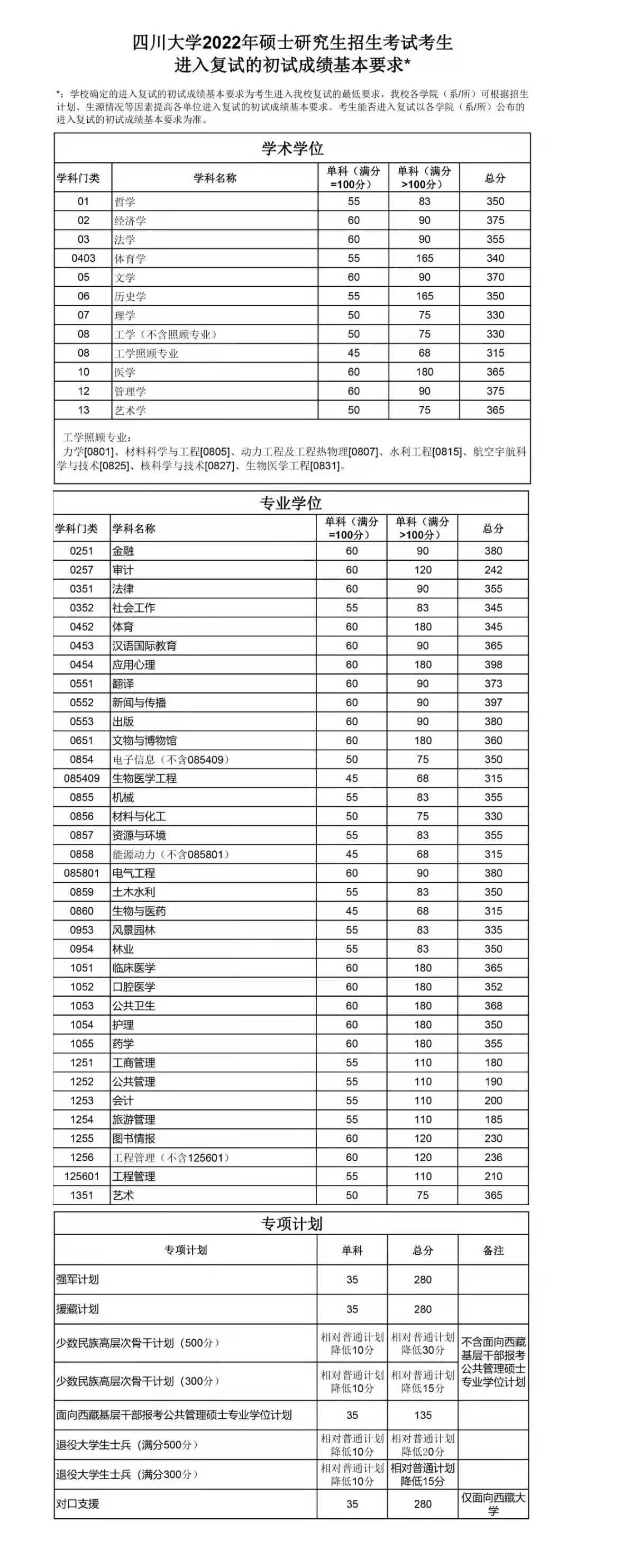 3月14日下午,四川大學公布了2022年碩士研究生招生考試考生進入復試的初試成績基本要求,具體如下: