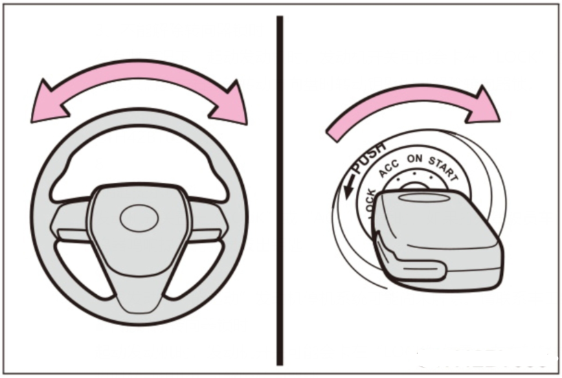在有些情況下,起動發動機時,發動機開關可能會卡在“LOCK”位置。這時候只需要左右輕輕轉動方向盤時轉動鑰匙即可解除轉向器鎖。