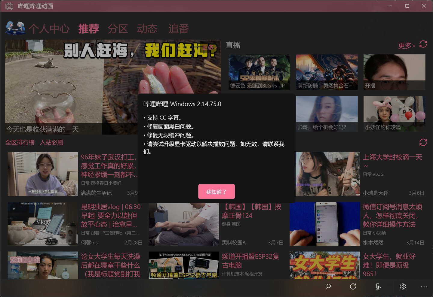 嗶哩嗶哩動畫 UWP 在 v2.14.74 更新中支持了 CC 字幕、修復畫面黑白問題、修復無限緩沖問題。官方群公告稱,該版本存在彈幕開關問題,已改為 v2.14.75 版本重新發布。