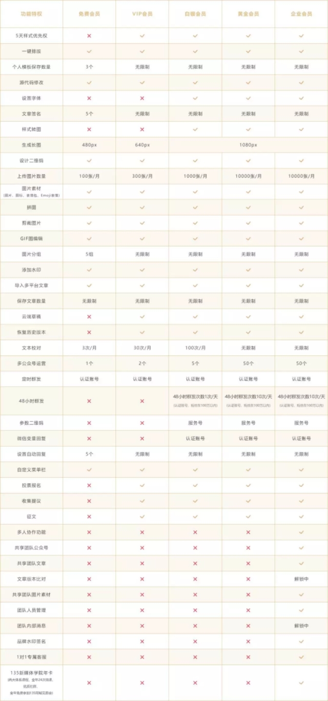 哈羅,小伙伴們,下午好啊今天天天給大家推薦一款,對于新媒體小編來說,耳熟能詳的一款微信排版工具:135編輯器操作非常簡單,即使是剛入新媒體行業的小白,也能輕輕松松搞定排版。用135編輯器排版,所見即所得,左邊選模塊,右邊直接編輯,可以保存模板,各種美妙的圖片排版。點擊邀請鏈接:http://www.135editor.com/origin/users/register/89f8ccb9f8704dfa186d01a654f6f48a就可以加入哦,偷偷告訴大家(點擊該鏈接,還可以獲得7天會員哦,一般人我不告訴,哈哈哈哈)當然,你也可以自己加入。網址在這里:http://www.135editor.com/origin/效果是一樣的。通過我的邀請加入135編輯器,相當于是對我的一種幫助和鼓勵。我自己會因為你們的支持而獲得會員權限,可以享受會員的所有權益,像是新樣式可以免費使用,圖片保存數量從100提升到1000,個人模板從3個提升到無限制,云端草稿和恢復歷史版本可以無限次使用,文本校對從3次升到100次等等,所以還勞煩大家幫個忙。附上會員權益表: