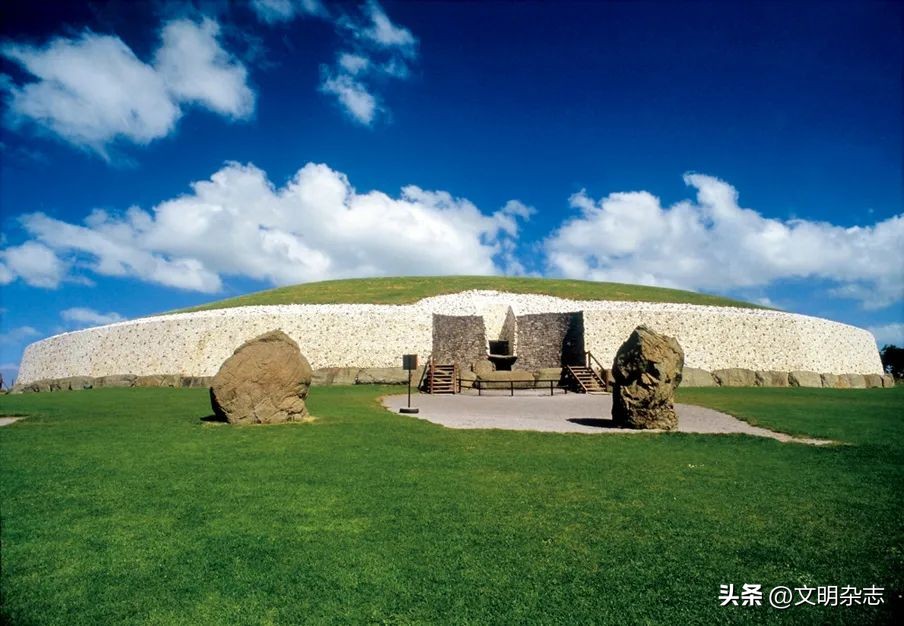 3座巨墓中,以紐格蘭奇巨墓最為神奇。它始建于公元前3100年左右,直到1699年才被發現。如今它是愛爾蘭最有名的史前遺跡,也是西歐發現的此類墓葬中水平最高、構思最奇特的一個。從外觀看,古樸的紐格蘭奇巨墓不過是一個微微隆起、遍覆青草的圓形大土堆,但其實,它的建造堪稱工程史上的奇跡。覆蓋墓室的石冢大約有20萬噸重,由97塊巨石組成的地基支撐。考古學家考證說,距紐格蘭奇最近的采石場也有3公里路程。而在5000多年前,僅把一塊4噸重的石頭從最近的采石場拖到這里,就需要8個壯勞力花上整整4天的時間,整座巨墓所費人工由此可見一二。