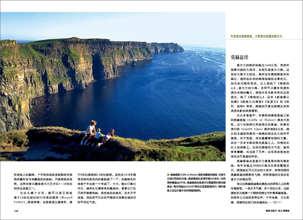 ■ 莫赫懸崖(Cliffs of Moher)是歐洲最高的懸崖,在愛爾蘭島中西部的邊緣。懸崖最高處距海平面200多米,沿西海岸覆蓋達8千米。莫赫懸崖也是愛爾蘭最重要的海鳥棲息地,每年有超過30000只海鳥在那里繁殖后代,同時懸崖上還生長著許多珍稀植物品種。