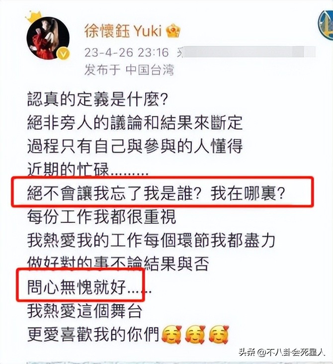 徐懷鈺卻覺得賈靜雯是在內涵她,緊接著就要回一個:我絕不會忘了我是誰,我在哪兒,還要跟一句問心無愧。