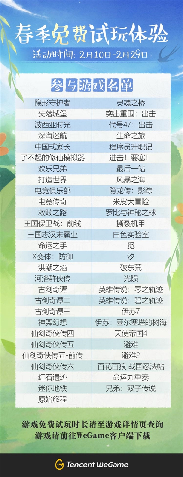 2月12日,騰訊WeGame游戲平臺官微宣布,WeGame平臺55款單機游戲開啟限時免費試玩,活動截至2月29日結束。
