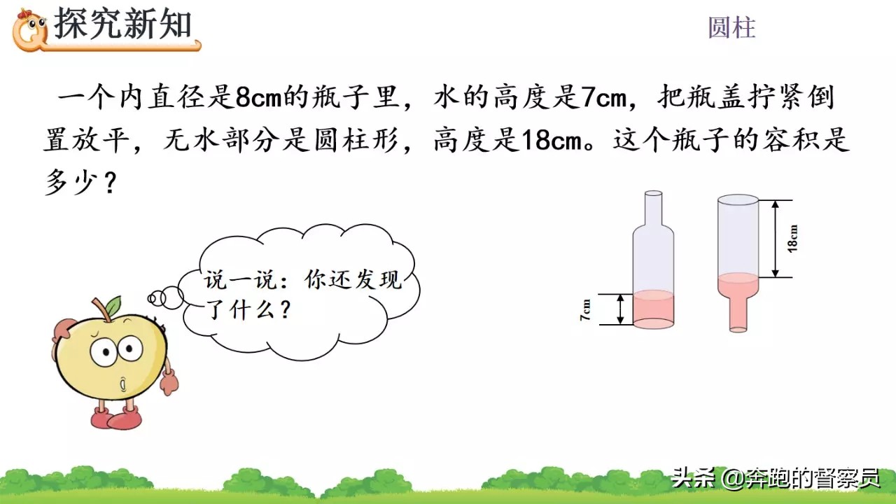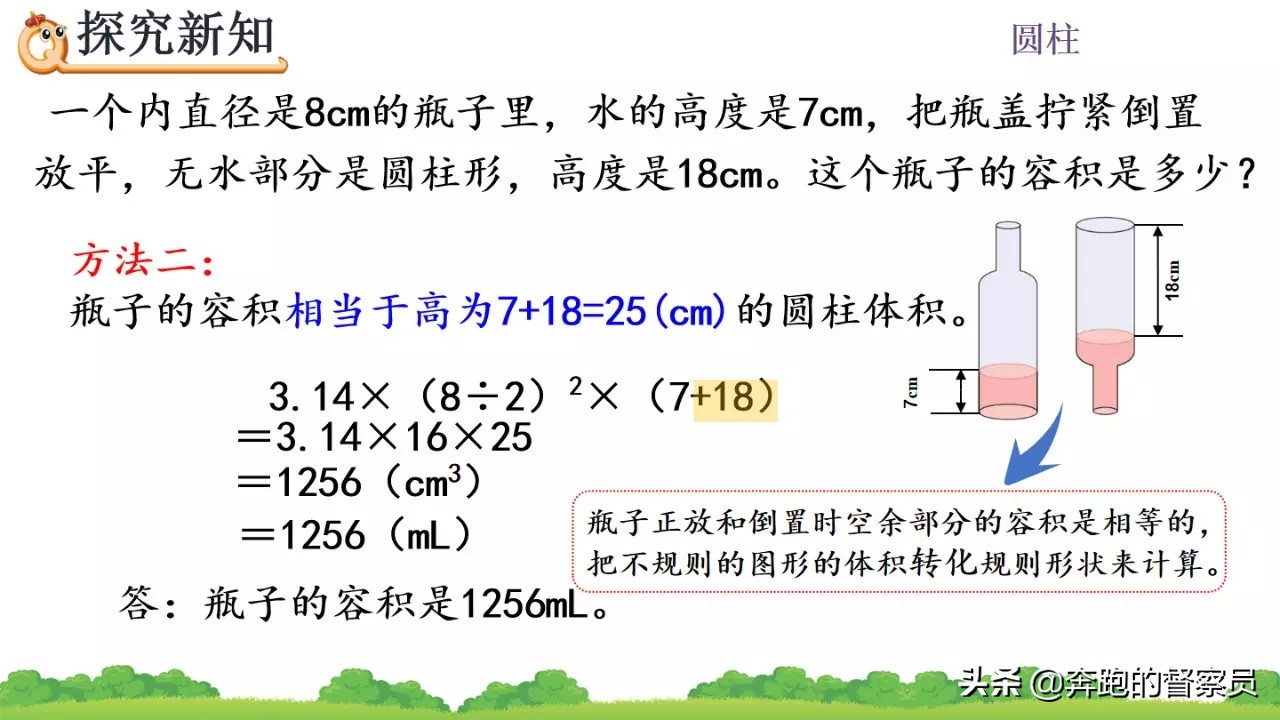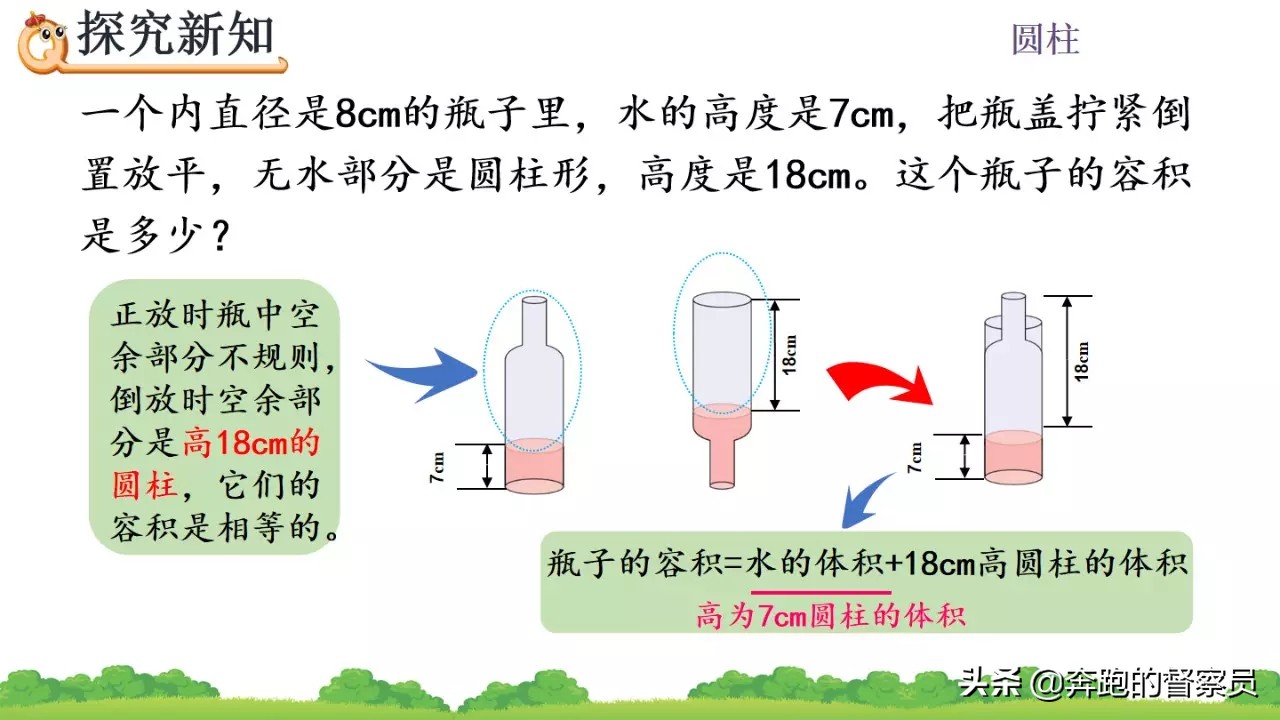 對于瓶子里邊裝了一部分的水,倒置前后水的高度以及體積的變化是我們利用圓柱體積計算的一個經典題型。其思考的方向主要在倒置前后,水的體積加上空瓶的部分的體積為整個瓶子的體積來展開思考和運算的。換句話說,在瓶子倒置前后瓶子中空余部分的體積是相等的所以我們就可以把不規則的體積計算轉化為圓柱體積的計算。