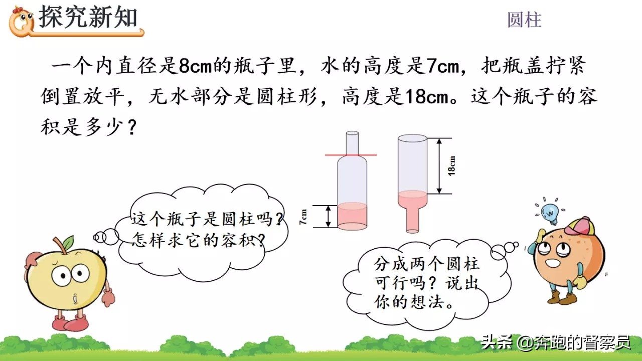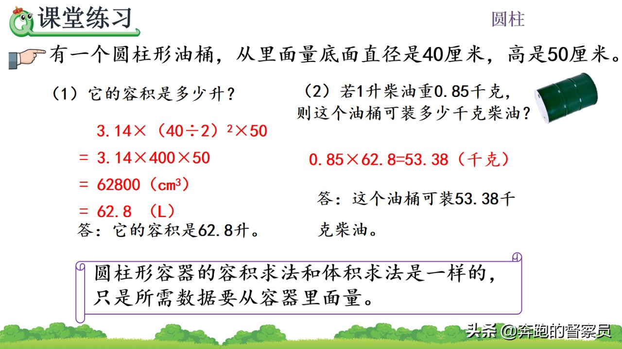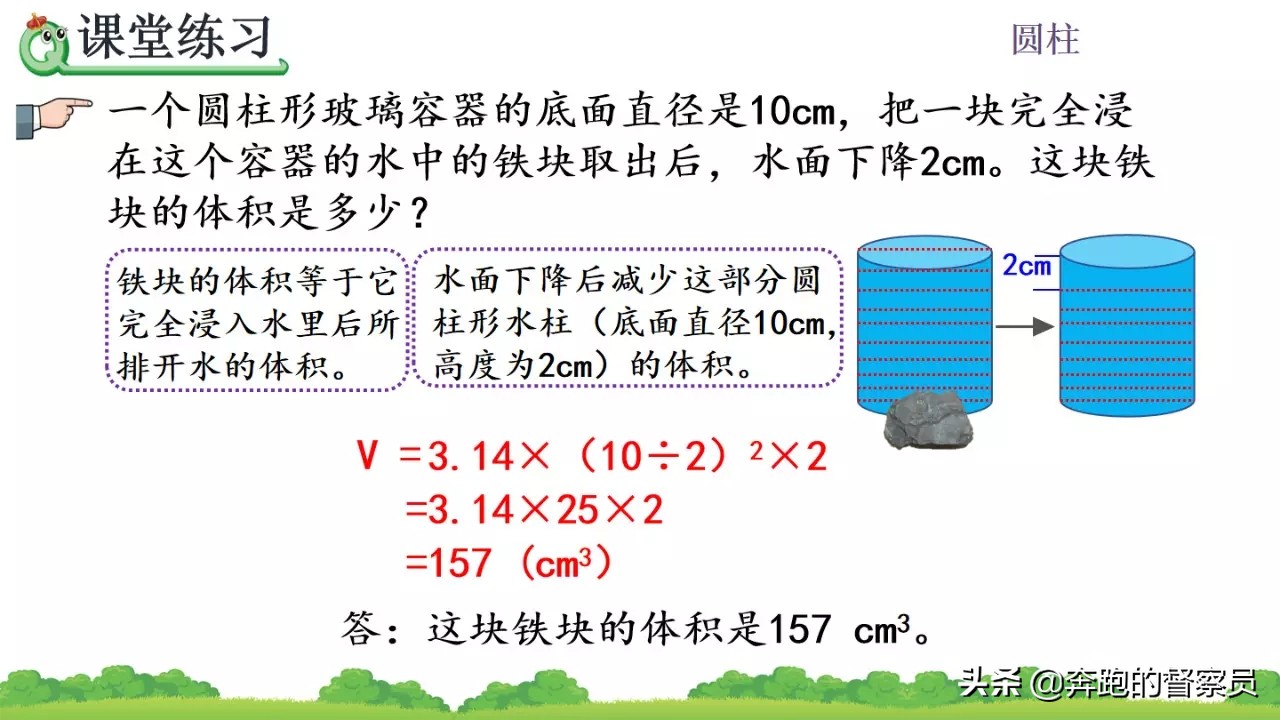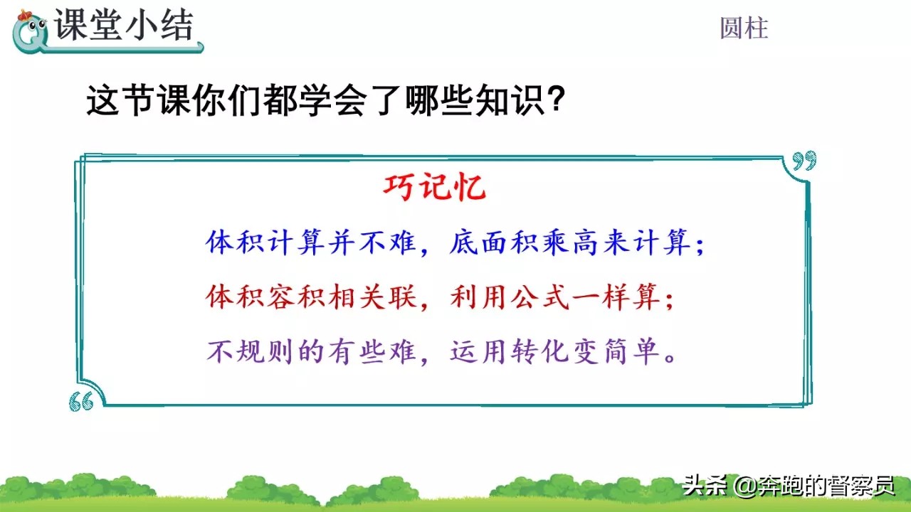 寫在最后:圓柱體積的應用除了對圓柱本身計算方式的了解以及公式的熟練使用以外,在實際的應用當中還有對于不規則物體體積的計算,若與圓柱的體積相關時,我們則需要使用轉化的方法。來求解不規則物體的體積,這時候對于題目條件的分析以及不規則物體與圓柱在轉化前后的變化。有清楚的了解,才能根據實際情況進行求解。