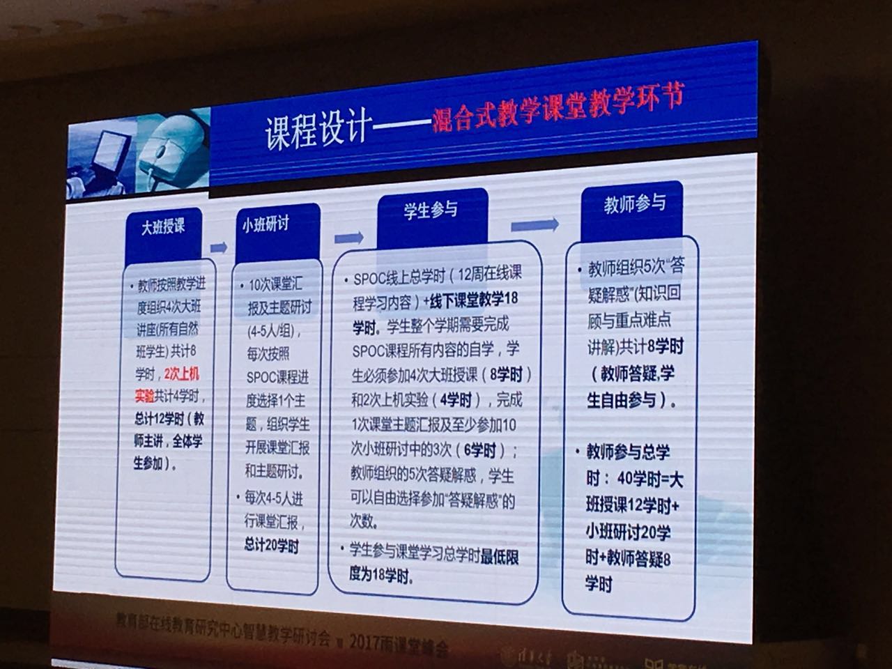 “有了資源和工具軟件后,教師在教學過程中的主導設計和精細化設計是非常重要的。”張興文介紹了哈爾濱工業大學在翻轉課堂時的實施情況,并總結在線教育工具在教學中的具體作用。