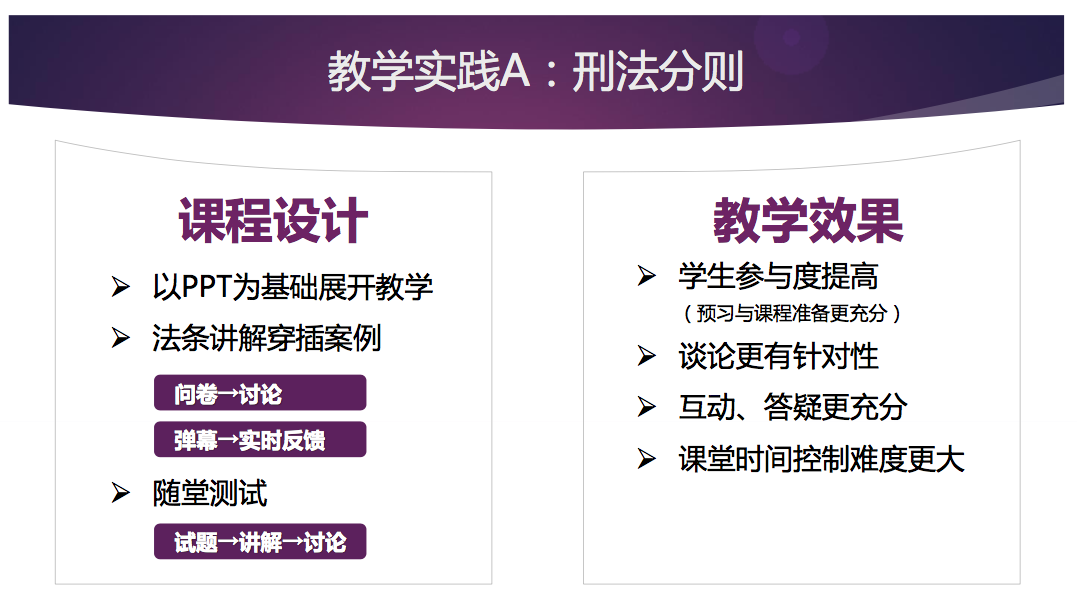 “刑法分則這門課,我們學習美國法學院教學模式,大量應用案例,強調知識點靈活掌握與應用,但在傳統課堂中學生的學習效果參差不齊。”在使用在線教育工具后的課程設計中,周凌說,課堂主要仍以PPT為基礎開展教學,PPT主要內容是法條的講解和案例,其中案例會被做成問卷形式,學生在手機端看到問卷之后可以進行現場討論。此外,教師還會在課堂中打開彈幕功能,學生可以將自己不懂的問題在彈幕進行實時反饋。