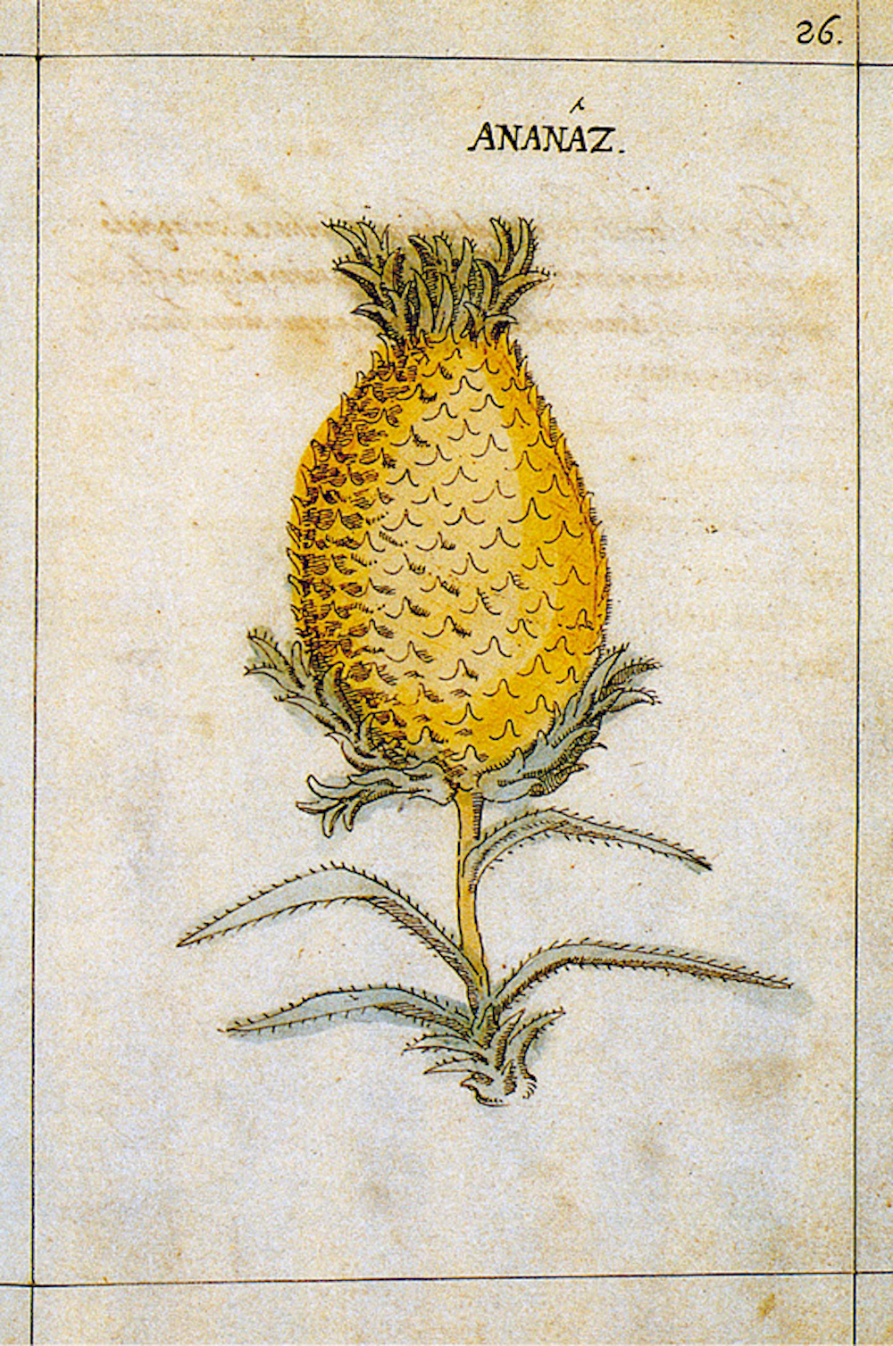 ananas(鳳梨)這個名字應源于瓜拉尼語。 曼努埃爾·戈迪尼奧·德埃雷迪亞 繪制,約1612年。 商務印書館 圖