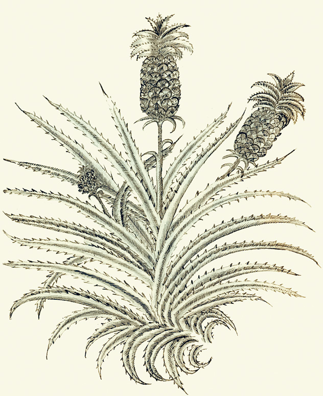 所有土地上都種著鳳梨,甚至連荒地上都是(……);每一株都結著大小不一的果實,或青澀或成熟。即使最大的鳳梨,也只有一個人雙手合圍的大小;人們將它們切成薄片,然后加少許鹽腌漬之后再食用(……);這是最好吃的水果,至少非常適合歐洲人的口味(……);每當看到一些鳳梨形單影只地生長在樹林里時,我都會想,這些當地人并沒有把這些美味的水果當回事,不過這僅僅是因為他們的懶惰和疏于照料。