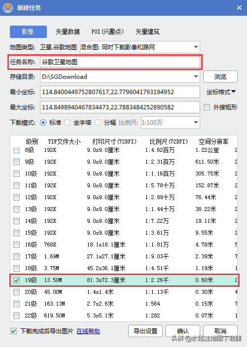 在雙擊后彈出的“新建任務”對話框內設置好任務的名稱并勾選上下載的級別,通常國內最高建議下載19級。