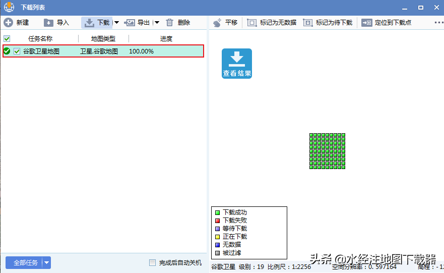到此就完成了使用水經注萬能地圖下載器下載谷歌衛星地圖,步驟總結就是,選擇地圖→框選范圍→選擇級別→導出設置→完成下載,有興趣的朋友可以使用水經注萬能地圖下載器試試。