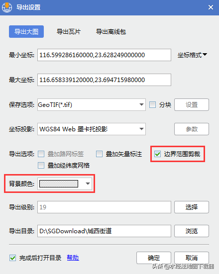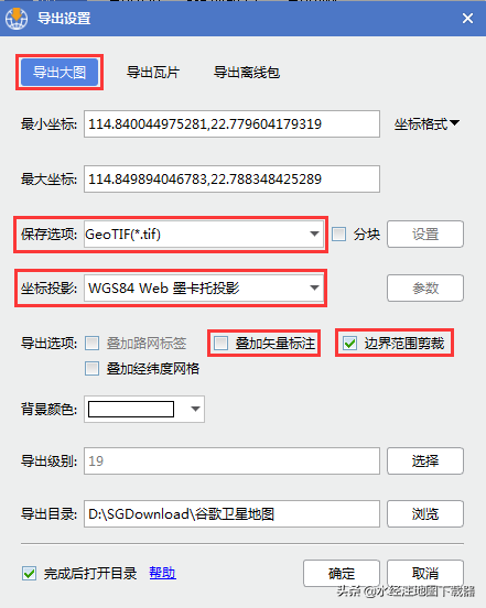 在彈出的“導出設置”對話框內,選擇“導出大圖”,這里主要關注 “保存選項”和“坐標投影”這兩欄,默認的是tif和地圖本身的坐標系,如果需要修改可以根據自己的實際情況修改。如果需要導出的衛星圖上疊加在下載器內的標注,可以勾選上“疊加矢量標注”,一般建議勾選上“邊界范圍裁剪”,避免導出的圖不是實際的下載范圍。