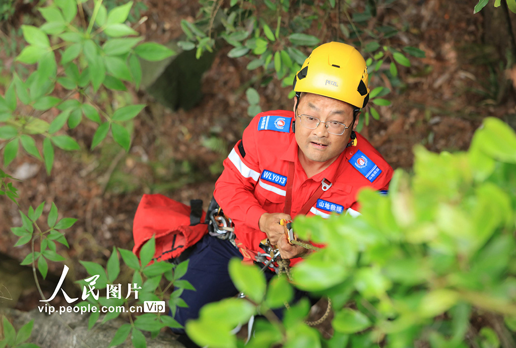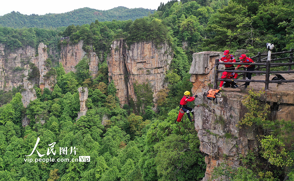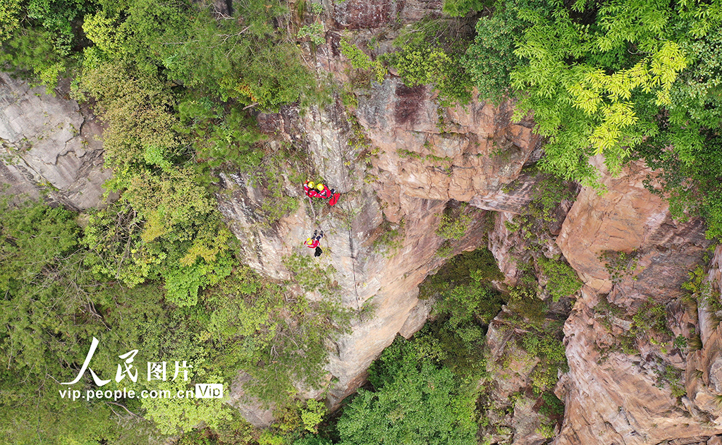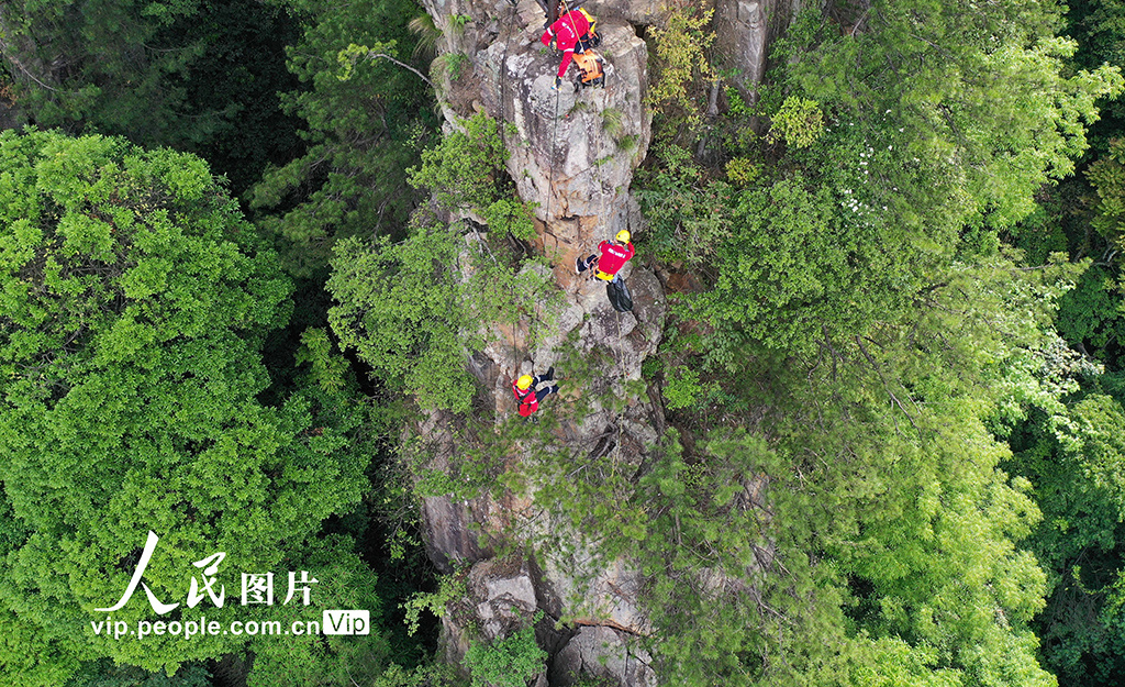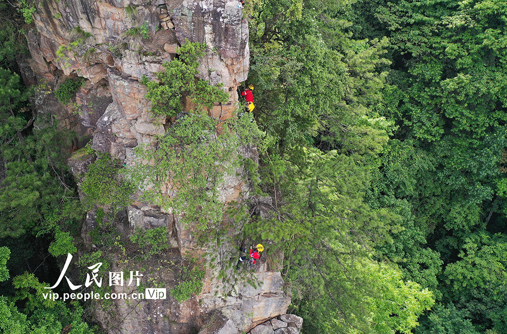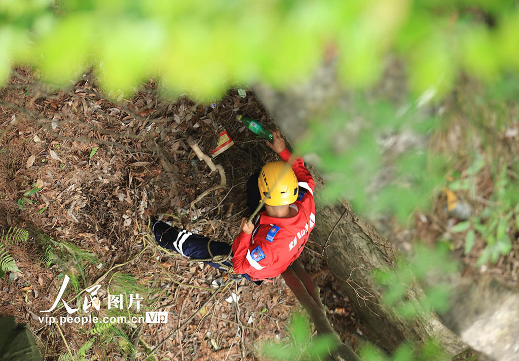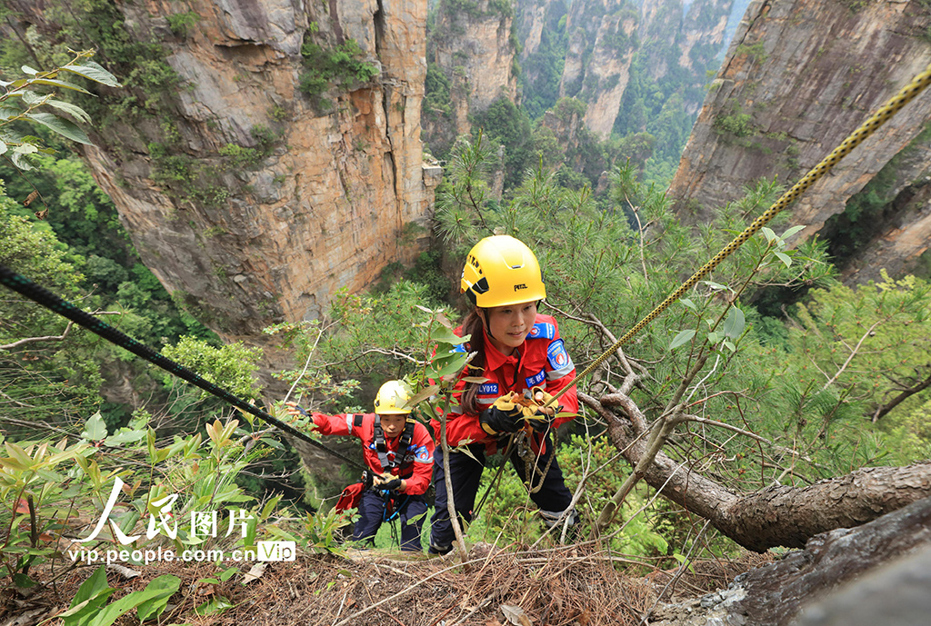 2023年5月14日,湖南省張家界市武陵源區山地應急救援隊隊員在天子山的懸崖峭壁間開展繩索救援適應性訓練的同時,義務撿拾叢林中的飲料瓶、塑料袋等垃圾,以實際行動呵護景區自然生態環境。該救援隊自2020年成立以來,借助專業技術力量義務為各景區提供應急救援服務,并定期開展撿拾垃圾等公益活動。吳勇兵攝(人民圖片網)