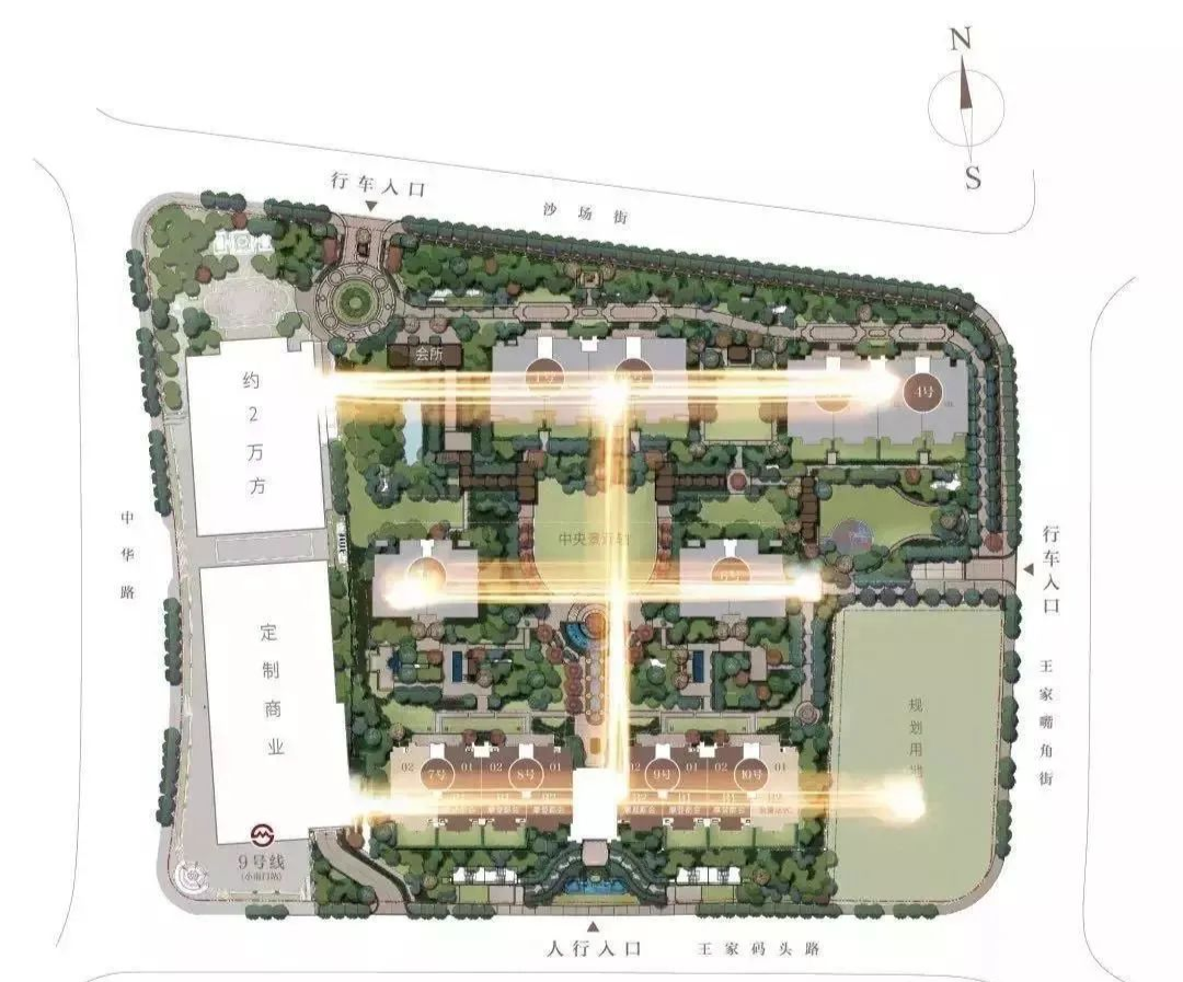 回顧董家渡外灘壹號院項目一街之隔的「融創外灘壹號院」,由6棟正統大宅點狀排布,呈現出一個端正的 “王”字布局,以百余米中央景觀大道為軸,并形成圍合式花園,使景觀氛圍充滿著皇家儀式感。