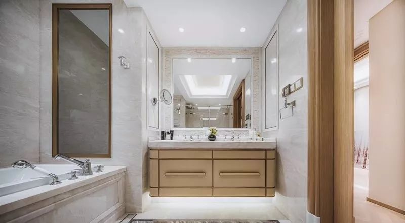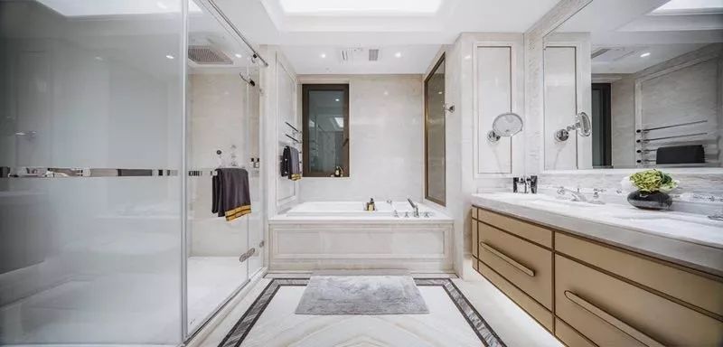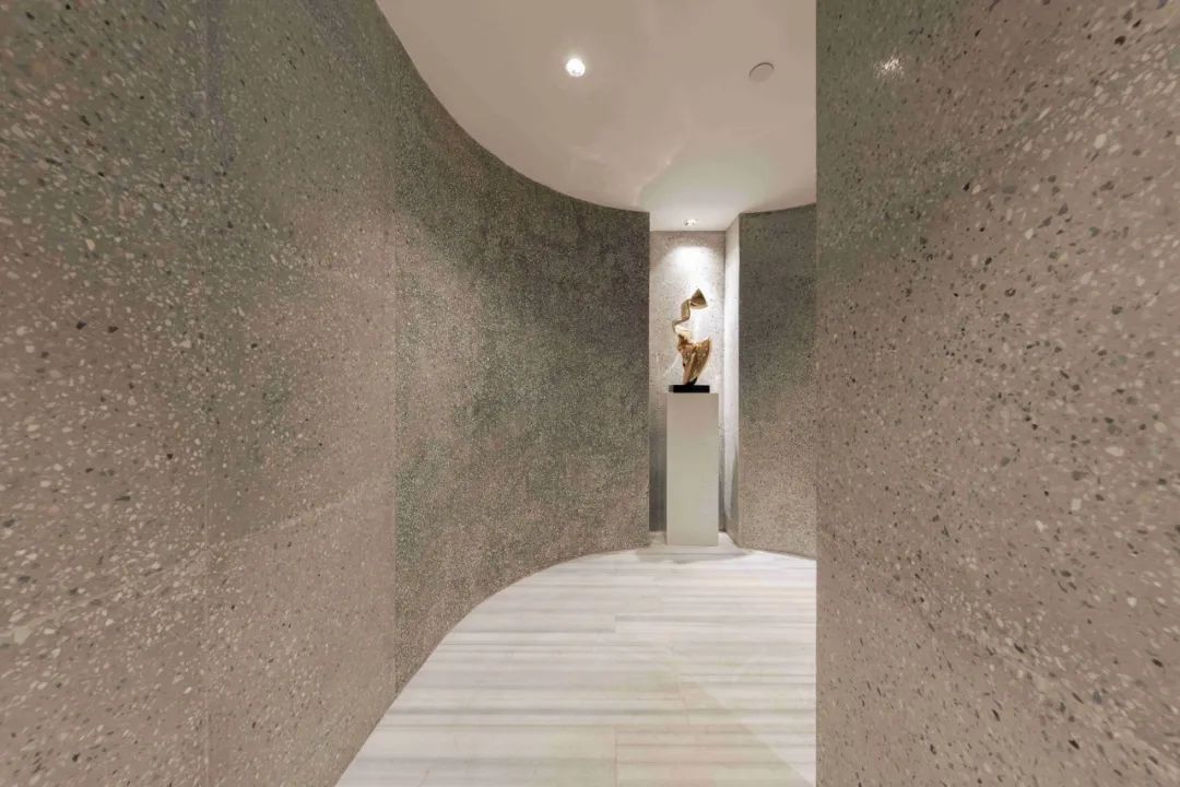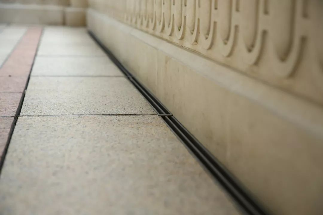 園林的主要動線上,融創采用“線性排水溝”的方式,用與路面相同的卡拉麥里金石材,制成排水槽蓋板,并在邊緣處用不銹金屬做成排水網,避免了水漬透縫而出,侵染地面。