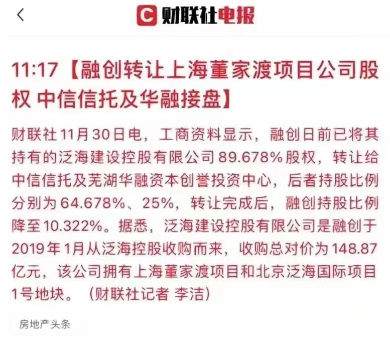 根據財聯社最新消息,融創近期將其位于南外灘董家渡的外灘壹號院的12和14地塊出讓,轉讓給了中信信托和蕪湖華融資本創譽投資中心,此輪股權轉讓后,中信信托在該項目中持股比例為64.678%,華融資本持股比例為25%,而融創僅有10.322%的股權!
