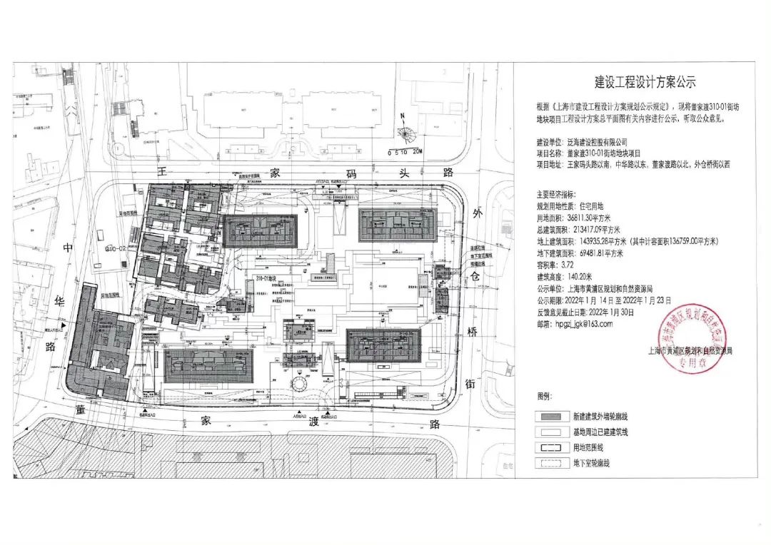 項目名稱:董家渡310-01街坊地塊項目項目地址:王家碼頭路以南、中華路以東、董家渡路以北、外倉橋街以西。用地面積:36811.30平方米。總建筑面積:213417.09平方米。容積率:3.72。建筑高度:140.20米