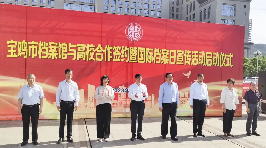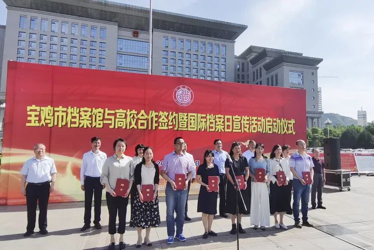 6月9日上午,在第16個國際檔案日到來之際,《寶雞市檔案館、寶雞文理學院、寶雞職業技術學院檔案事業戰略合作框架協議》簽約儀式在市行政中心廣場舉行。市委副書記段小龍,市委常委、市政府副市長時鎮,市人大副主任車爽,市政協副主席李軍科出席儀式。市檔案館副館長閆海成,學院黨委常委、副院長宮先成,寶雞文理學院檔案館館長楊科正代表三方簽署協議。儀式由市政府副秘書長、市檔案館館長曹建國主持。