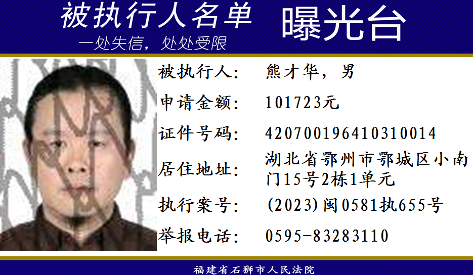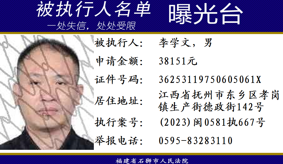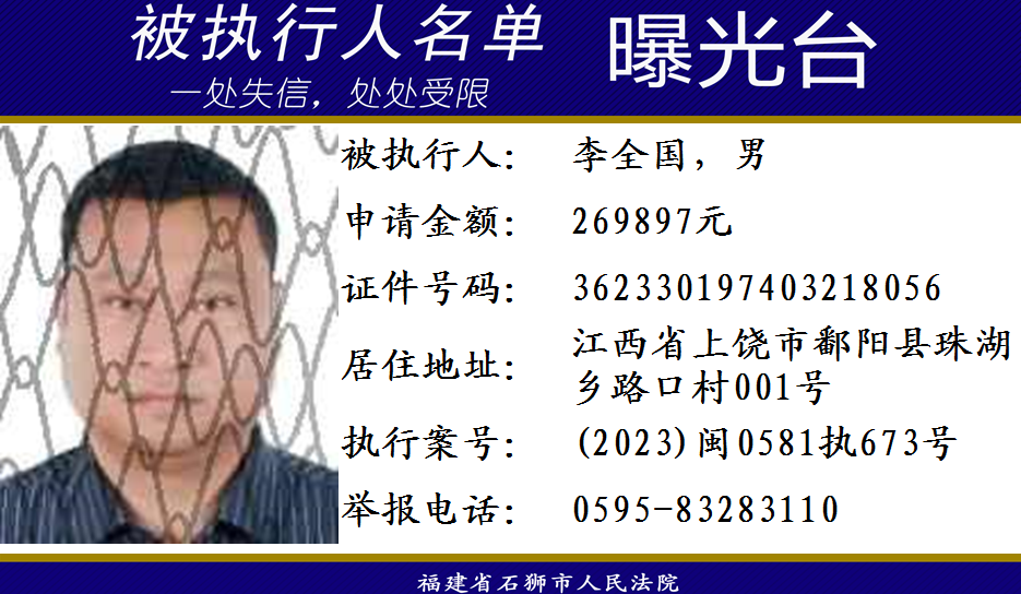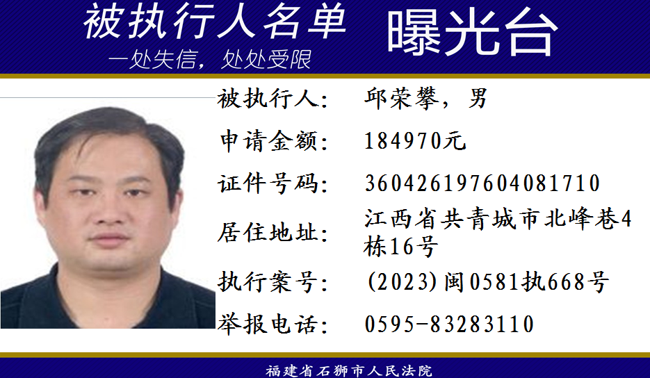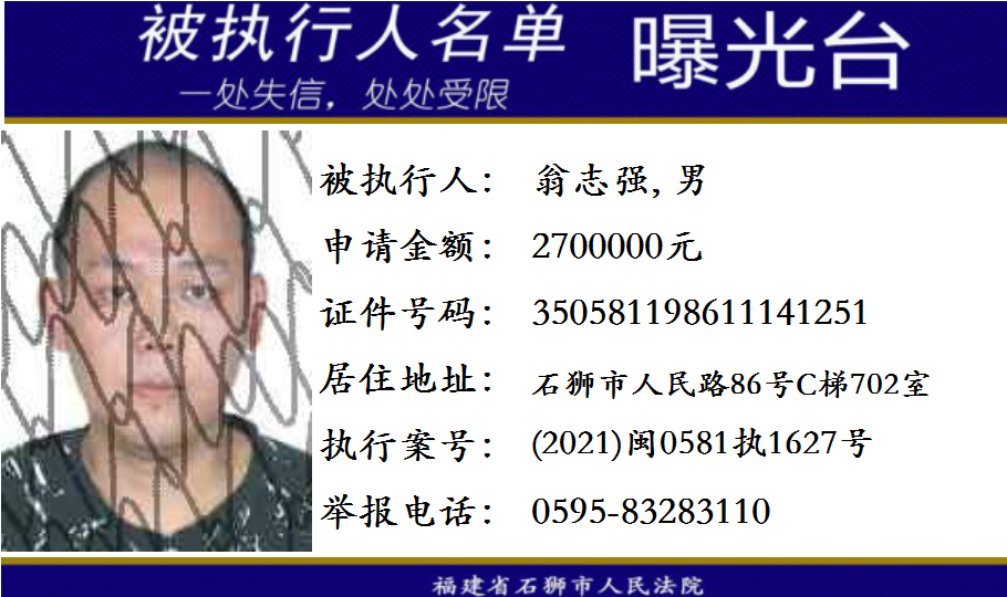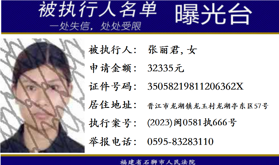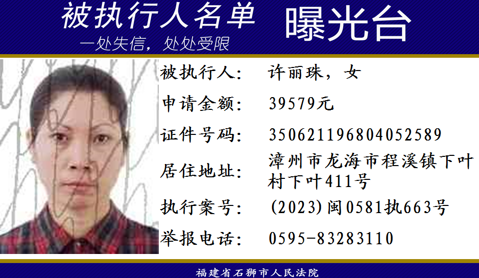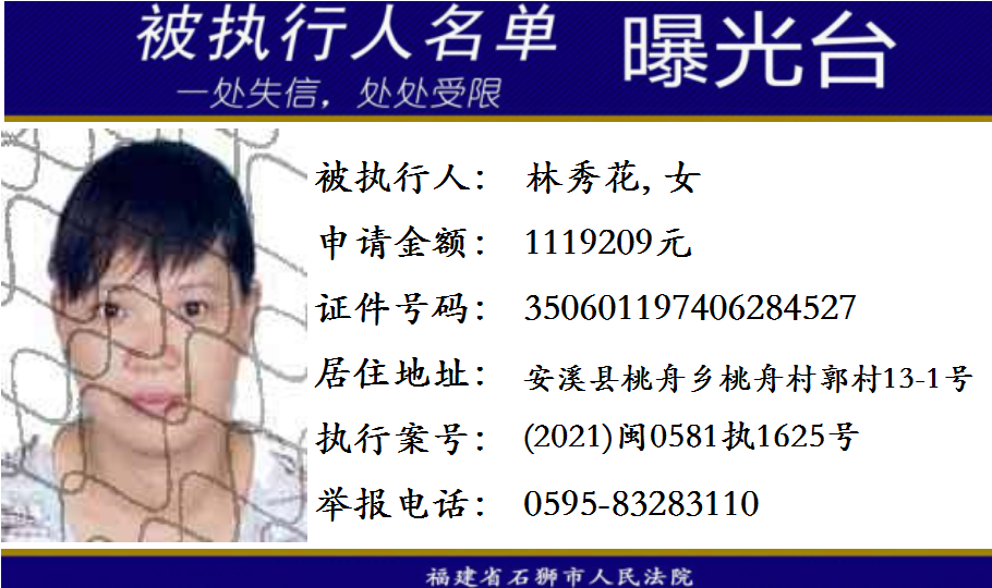 導讀曝光被執行人我們是認真的看看本期“曝光臺”都有誰?掃描二維碼,關注石獅法院官方抖音號,查看更多高清圖。法院執行信息公開網[http://zxgk.ss