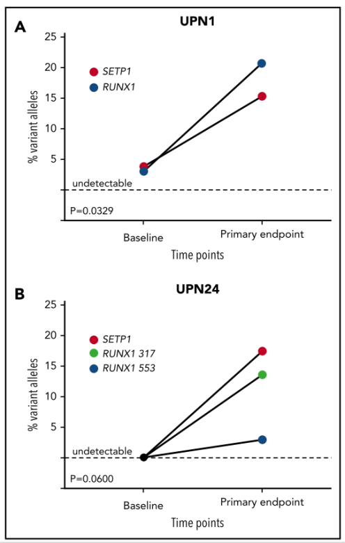 體細胞突變方面,64例標本可用患者有29(45%)例在艾曲波帕使用前檢測到髓系腫瘤或AA相關基因突變(63種),其中10例為治療有效病例,14例為治療無效病例;12例中有5例發生克隆演變;以上各組體細胞突變比率無明顯差別。在艾曲波帕治療終點,8例有效及6例無效患者出現新發突變;相反,8例有效及9例無效患者原有突變消失;最終結果為治療終點45%突變率,與艾曲波帕治療前相同。此外,上述63種基因陽性克隆總量在艾曲波帕治療前后也無明顯變化,即使64例患者共同分析、有效患者單獨分析、無效患者單獨分析及克隆演變患者單獨分析也未發現艾曲波帕治療前后陽性克隆總量變化。雖然,有1例患者檢測提示艾曲波帕使用后SETBP1及RUNX1基因變異等位基因頻率(VAF,可理解為基因突變比率)顯著升高,染色體核型提示7號染色體長臂缺失克隆也顯著升高(圖2,UPN1);但基因突變VAF升高并不與克隆演變相關,有2例患者出現少見的ASXL1和STAG2突變,艾曲波帕治療后也出現7號染色體異常,但是上述兩種基因VAF并無顯著升高,提示基因突變并不在異常染色體克隆上。另有1例患者也出現新發SETBP1和RUNX1基因突變,但其并無染色體異常,艾曲波帕治療后達到完全緩解,且停藥2年后仍然保持血液學緩解(圖2,UPN24)。
