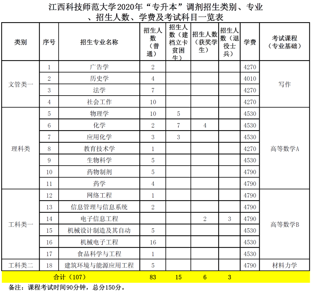 附件一:江西科技師范大學2020年“專升本”調劑招生類別、專業、招生人數、學費及考試科目一覽表