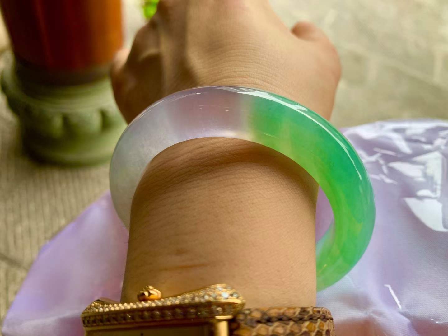 幾十萬以上的手鐲完全可以兼顧翡翠的種水和顏色,往往能戴這樣的手鐲的都是資深翠友,對于翡翠十分熱愛,或者有很扎實的經濟基礎。這個價位的手鐲不是普通的首飾,是彰顯身份的珠寶,戴在手腕上無論是種水還是顏色都是十分吸睛的。