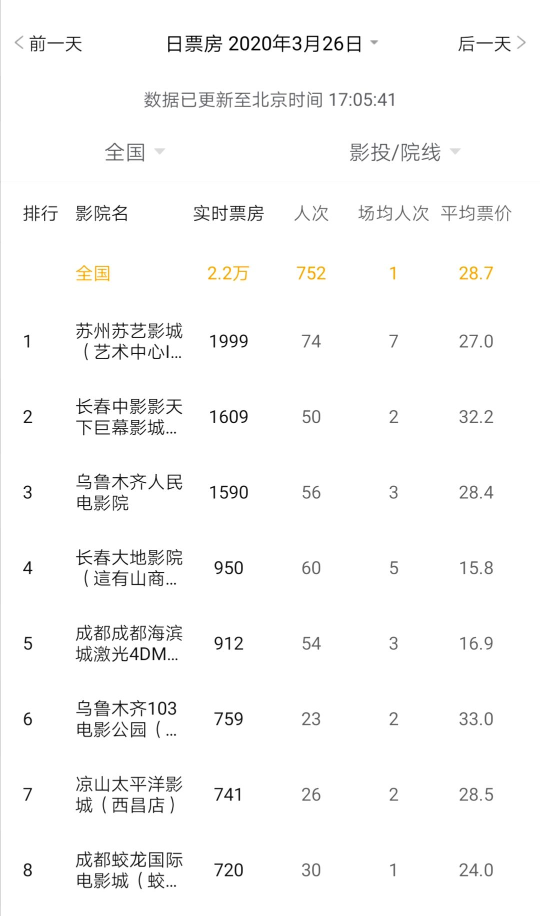 李華遇到的狀況,其實是很多復工影院所面臨的問題。據貓眼專業版公布的數據顯示,目前全國530余家影院復工,截至下午5點,今日全國影院票房僅2.2萬元,觀看人次共有750余人次,平均每家影院場均觀影人次大多為1人次。今日恢復營業的成都海濱城激光4DMX影院有54名觀眾,排在了全國第五位。
