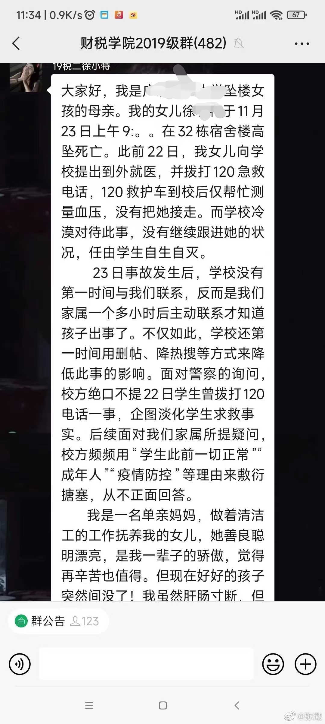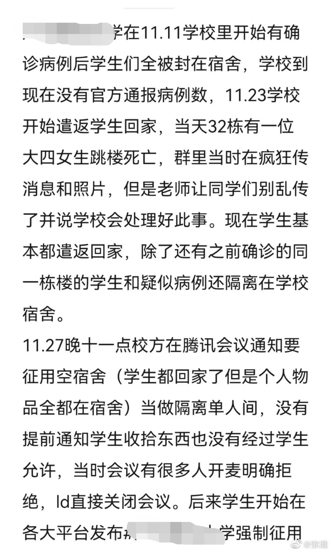 而在23日事故發生后,學校也并沒有第一時間與女生母親聯系,反而是家屬一個多小時后主動聯系才知道孩子出事了。不僅如此,學校還第一時間用刪帖、降熱搜等方式來降低此事的影響。面對警察的詢問,校方絕口不提22日學生曾撥打120電話一事,企圖淡化學生求救事實。后續面對我們家屬所提疑問,校方頻頻用“學生此前一切正常”“成年人”“疫情防控”等理由來敷衍搪塞,從不正面回答。