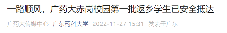 11月26日,廣藥廣州校區赤崗校園第一批學生111人,搭乘專車成功離校返鄉。