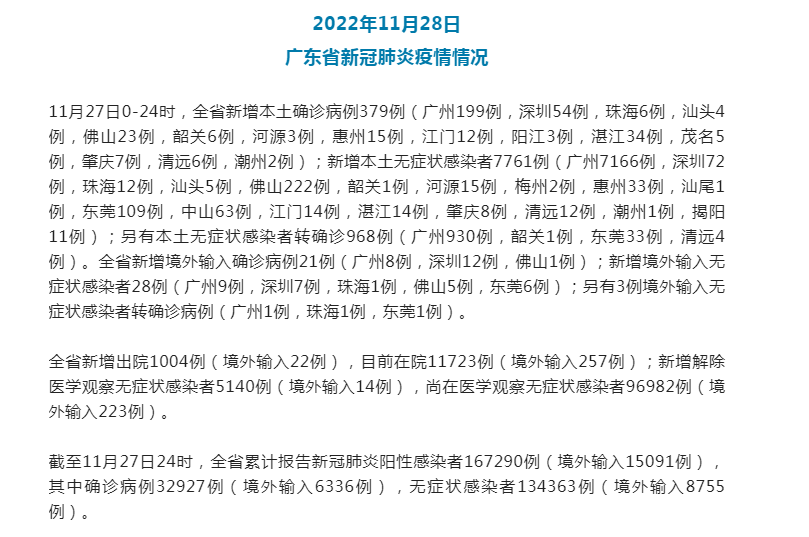 據廣東省衛健委,截至11月27日24時,全省新增本土確診病例379例(廣州199例,深圳54例,珠海6例,汕頭4例,佛山23例,韶關6例,河源3例,惠州15例,江門12例,陽江3例,湛江34例,茂名5例,肇慶7例,清遠6例,潮州2例);