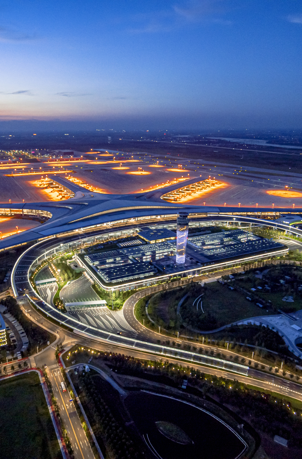 “綠色機場”彰顯節能特色。率先將“海綿城市”理念引入機場建設,構建多功能生態基礎設施,全部建筑按《綠色建筑評價標準》星級設計,綠色機場和海綿機場項目同時被住建部列入國家低能耗綠色建筑園(區)示范工程。建設19km的綜合管廊,國內首例污水、燃氣管道等7類市政管線全部入廊,作為住建部全國推行綜合管廊建設的重點試點項目,是全國第一個應用于大型國際機場的地下綜合管廊,為地下空間集約化開發貢獻了“青島經驗”。建成航站樓、GTC雙冷源溫濕度獨立空調系統,比同等條件下的大型樞紐節能30%以上,被科技部列為國家“十三五”公共交通樞紐節能關鍵技術與示范,獲中國工程院院士高度評價。2018年11月,航站樓屋面采光和通風設計獲得第六屆Active House 國際聯盟大會頒發的“AH采光卓越獎”,也是當時民航業中唯一獲此殊榮的項目;2021年10月,“海綿機場示范工程”、“綠色照明示范工程暨綠色機場項目”入選住建部首批民航示范項目。