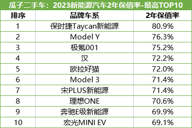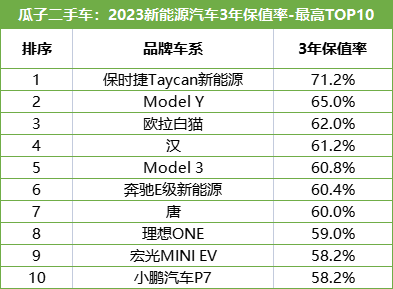 瓜子二手車大數據顯示,在售新能源二手車3年保值率最高Top10中,最高是保時捷Taycan新能源,3年保值率為71.2%。排名第二到第十名的分別是,特斯拉Model Y(65.0%)、歐拉白貓(62.0%)、比亞迪漢(61.2%)、特斯拉Model 3(60.8%)、奔馳E級新能源(60.4%)、比亞迪唐新能源(60.0%)、理想ONE(59%)、宏光MINI EV(58.2%)以及小鵬P7(58.2%)。基本上涵蓋了新能源的熱銷品牌,遺憾的是三大造車新勢力中,理想與小鵬均有車系入選,而蔚來品牌旗下無車系入選3年保值率最高的TOP10。