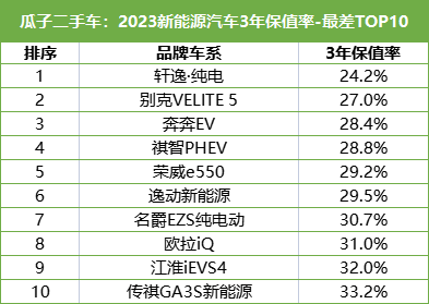 趨勢二:新能源3年保值率最差Top10發布,軒逸純電以24.23%墊底