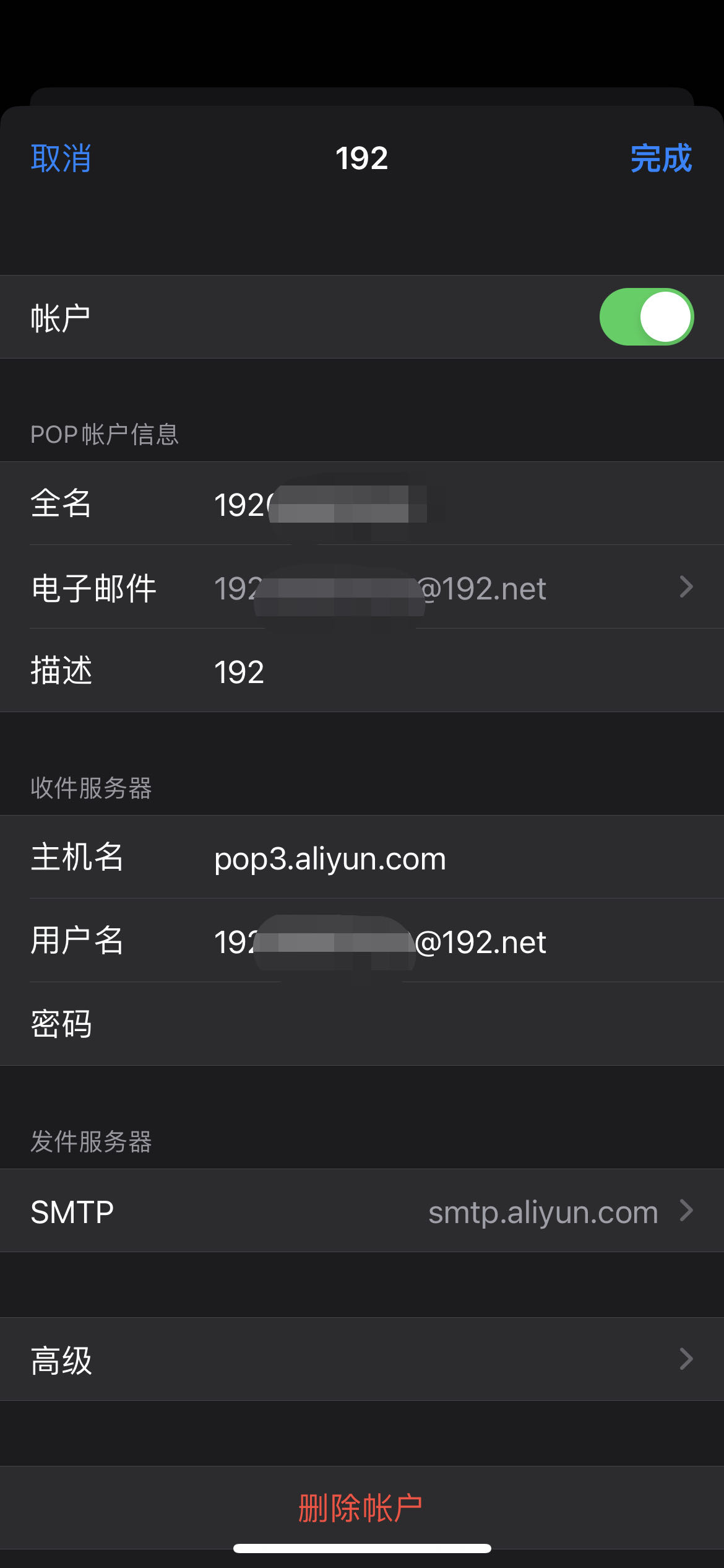 4.點“下一步”后,到了很重要的一步,就是在“POP賬戶信息”中分別填入你的全名、電子郵件、描述,然后在收件服務器中填入“pop3.aliyun.com”,特別注意的是這里的用戶名要寫郵箱全稱帶net后綴。