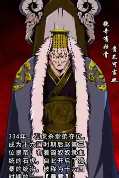 石虎初年投靠漢國君主劉淵,后與漢主交惡,率軍獨立。同年十一月,石勒即位稱趙王,改元稱趙王元年,即以襄國為都城,史稱后趙。世界歷史上從奴隸到皇帝的唯一一人。在位時殘暴不仁,稱漢人為“兩腳羊”,行軍途遇漢人村落便對其燒殺搶掠,男人全被殺s,女人押回軍中,留著晚上侵犯,或是餓時s掉吃肉,石虎的兇殘令人發指。動漫中對戰霍去病,本想憑借武器將其擊敗,不料自己的實力和對方完全不在同一水平線上,被霍去病十步貼臉一刀斬下頭顱。