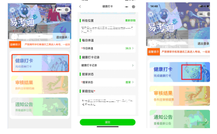 (三)考生須登錄“甘肅教育考試易考通”微信小程序進行5次健康打卡。第一次健康打卡時間:10月21日8:00時至22日18:00時;第二次健康打卡時間:10月26日8:00時至18:00時;第三次健康打卡時間:10月29日8:00時至18:00時;第四次健康打卡時間:11月2日8:00時至18:00時;第五次健康打卡時間:11月4日8:00時至16:00時。健康打卡時“易考通”會通過人臉及身份證識別方式對打卡人身份進行驗證,自動獲取打卡人所處地理位置和近一周核酸檢測情況(具體操作流程見附件1)。