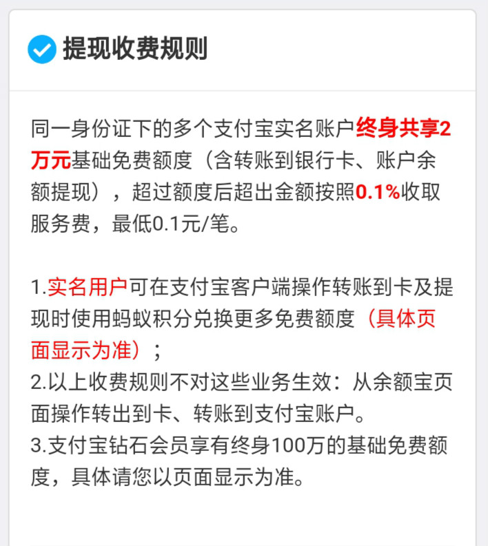 余額轉到網商銀行,再由網商銀行轉出到銀行卡,有每年免費10萬的提現額度;注意這個免費額度的有效期是年;
