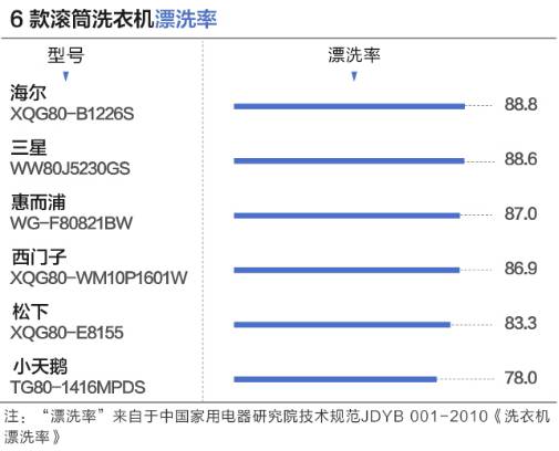 海爾、三星的漂洗率較高,分別達到88.8%和88.6%;而小天鵝的漂洗率只有78.0%,表現稍遜。(如圖)